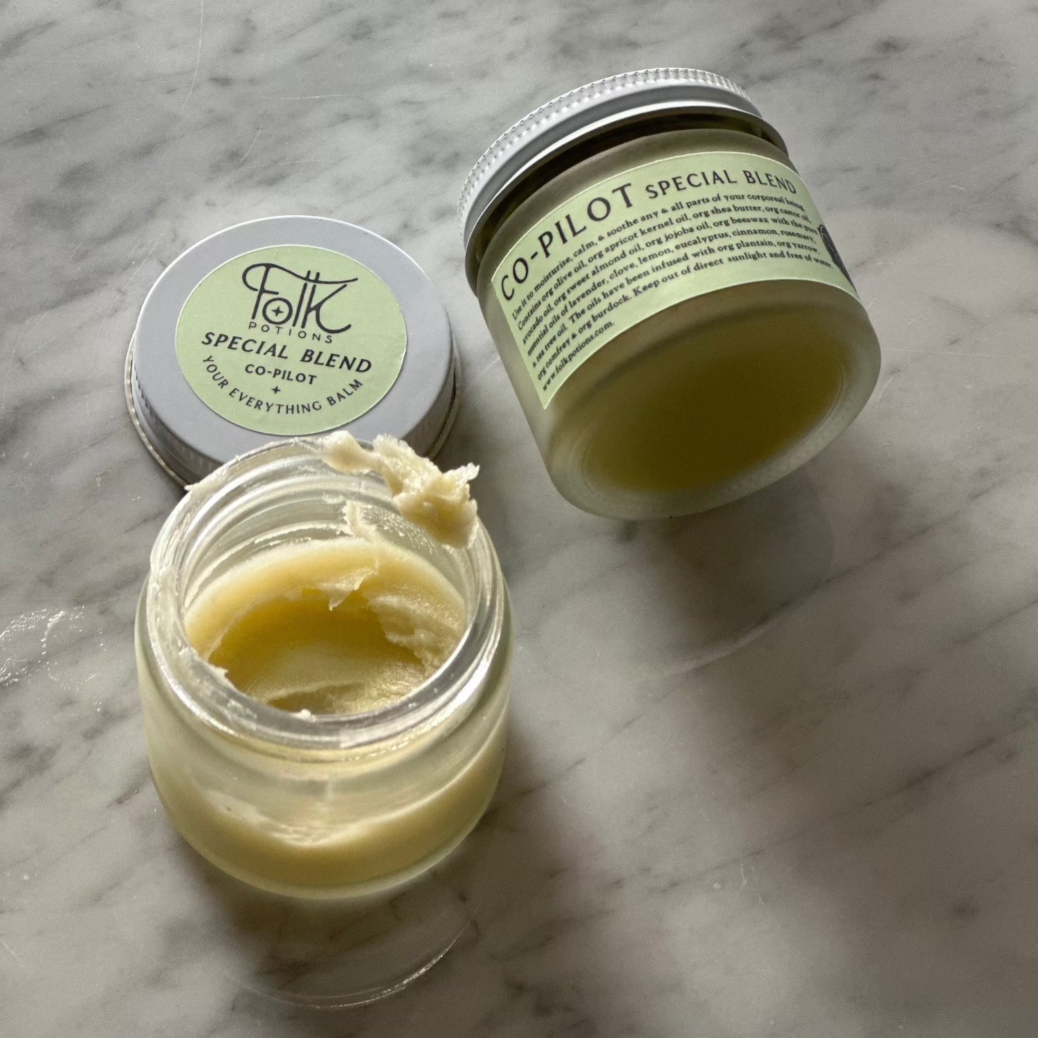 Organic burdock, plantain, yarrow and comfrey are infused in the oils of olive, castor, apricot kernel oil, sweet almond and avocado. After the herbs are filtered out, the balm is set with organic unrefined Shea butter and beeswax. Then it is lightly scented with the essential oils of This unexpected blend of essential oils including lavender, rosemary, peppermint, cinnamon, clove, lemon, eucalyptus, and tea tree. Co-Pilot is good for any and all parts of your corporeal being.