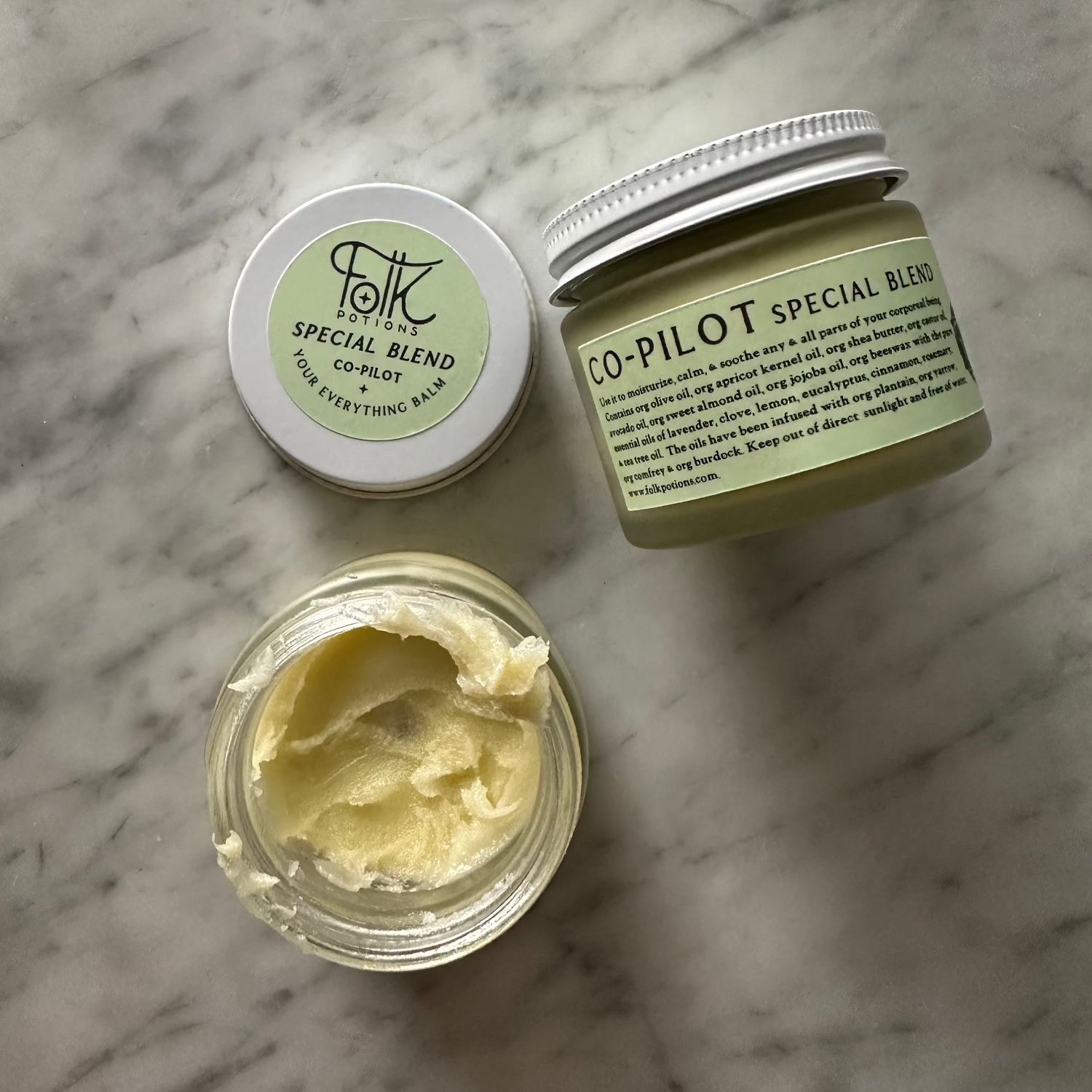 Co-Pilot is a luscious, moisturizing and soothing balm. with a heavy dose of Shea butter and infused herbs.