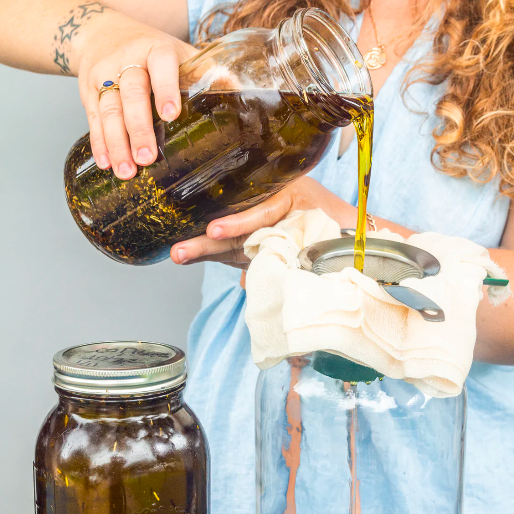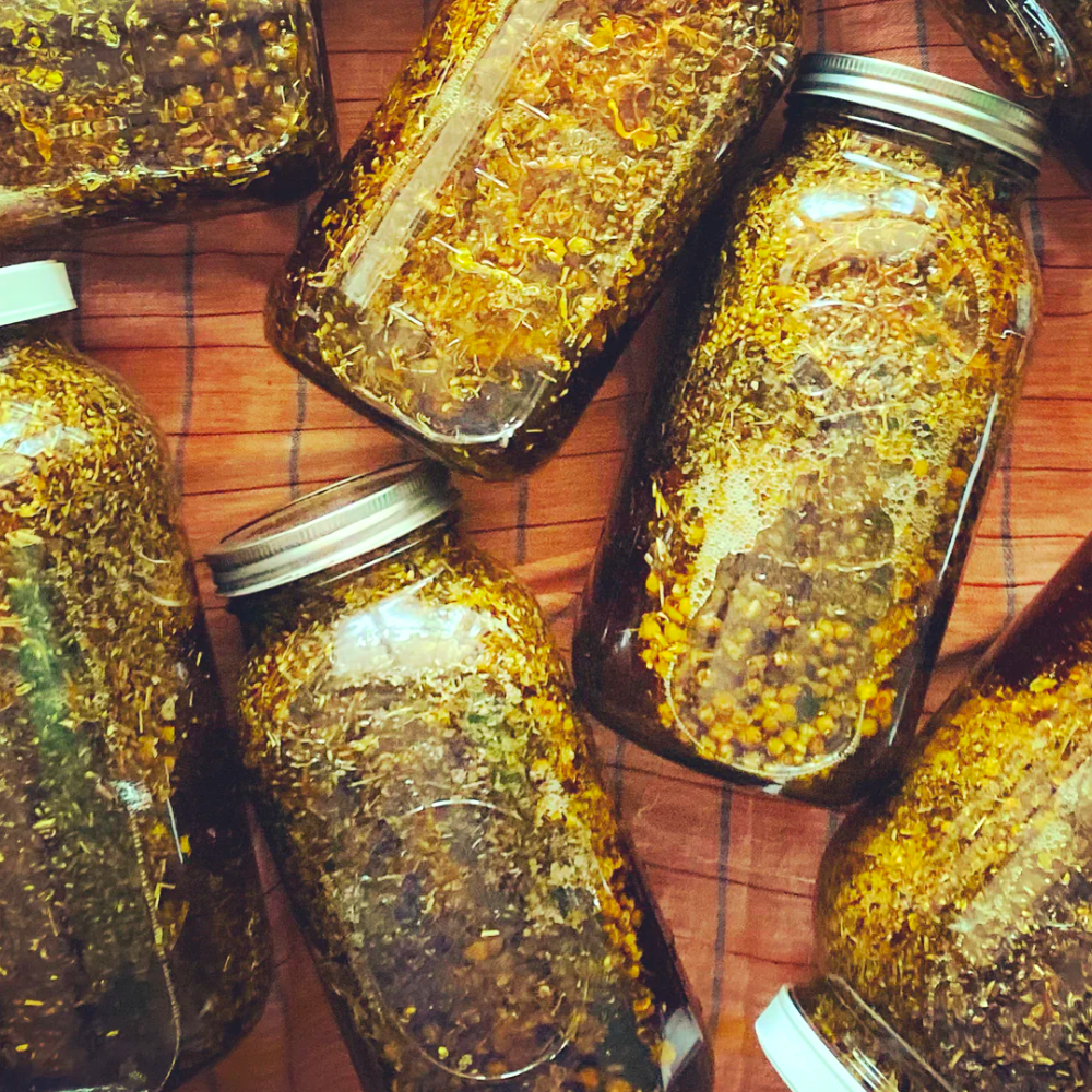 Folk Potions Magic Face Oil starts with organic extra virgin olive oil, organic castor oil, avocado oil, and organic apricot kernel oil. This luscious moisturizing blend is infused with organic flowers for 6 weeks. Lavender, calendula, yarrow, chamomile, plantain, and dandelion all are known for their nurturing powers. These plants absorb the energy of the sun & the earth and transform it into moisturizing beauty. Rose Hip Seed Oil is added for the cell regenerating, fine line-tightening and collagen-producing qualities it provides. Finally, the essential oils of chamomile, rose, neroli and frankincense are blended in. The smell is darkly floral and misty.